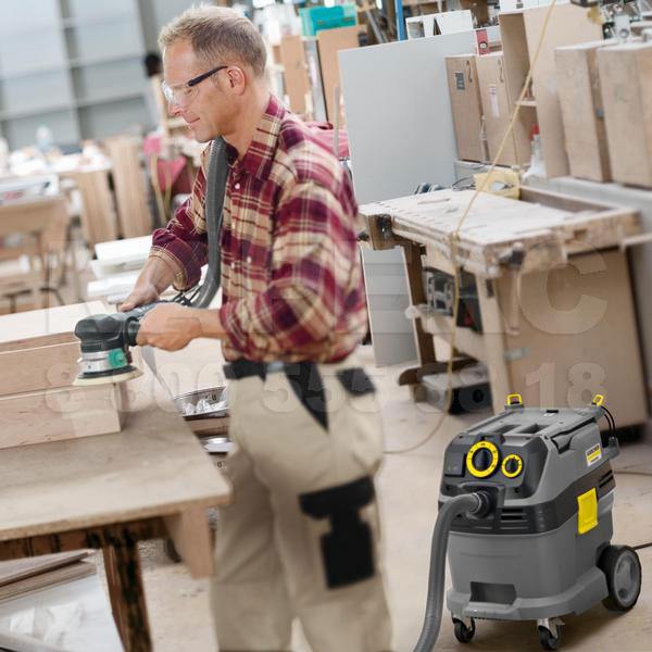 Керхер НТ 30/1 Tact Te L имеет небольшой вес (13.5 кг). Удобная ручка облегчает его перемещение. Мусоросборник большой – его объем составляет 30 л. Особенность профессионального пылесоса Karcher NT 30/1 Tact Te L – наличие встроенной розетки под электроинструмент. При работе в мастерских это позволяет сразу собирать образующийся мусор благодаря режиму синхронизации. Для присоединения электрического инструмента используется муфта.